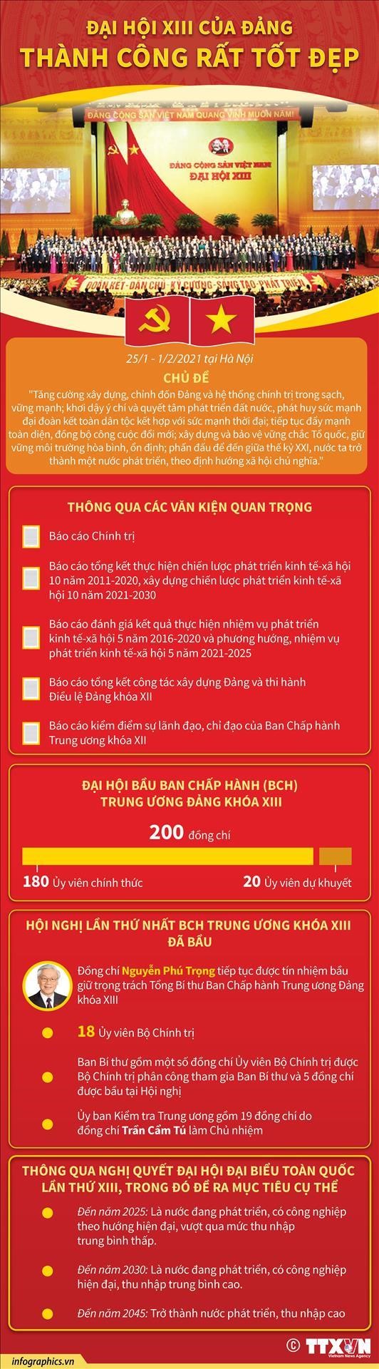 Đại hội bầu ra Ban Chấp hành Trung ương Đảng khoá mới gồm 200 đồng chí, trong đó 180 đồng chí Ủy viên chính thức, 20 đồng chí Ủy viên dự khuyết. Tại Hội nghị lần thứ nhất Ban Chấp hành Trung ương Đảng khóa XIII đã họp để bầu Bộ Chính trị, Ban Bí thư Trung ương Đảng, Ủy ban Kiểm tra Trung ương. Đồng chí Nguyễn Phú Trọng được tín nhiệm bầu tiếp tục giữ chức vụ Tổng Bí thư Ban Chấp hành Trung ương Đảng khóa XIII.