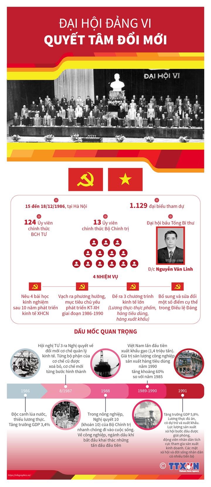 Thời gian: 15 đến 18/12/1986 tại Hà Nội. Dự Đại hội có 1.129 đại biểu thay mặt gần 1,9 triệu đảng viên trong toàn Đảng.