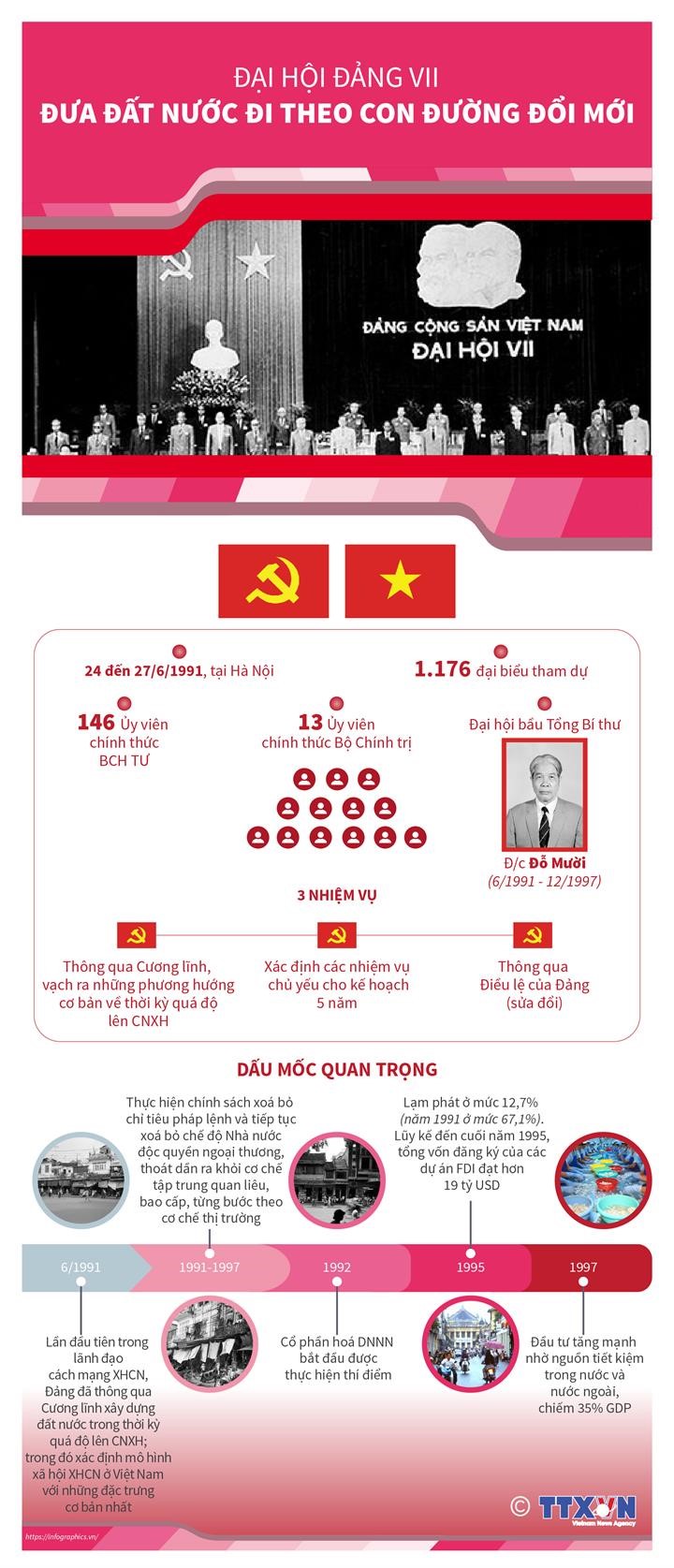 Với nhiệm vụ “Tiếp tục thực hiện nhiệm vụ đưa đất nước đi theo con đường đổi mới”, Đại hội VII lần đầu tiên thông qua Cương lĩnh xây dựng đất nước trong thời kỳ quá độ lên CNXH.